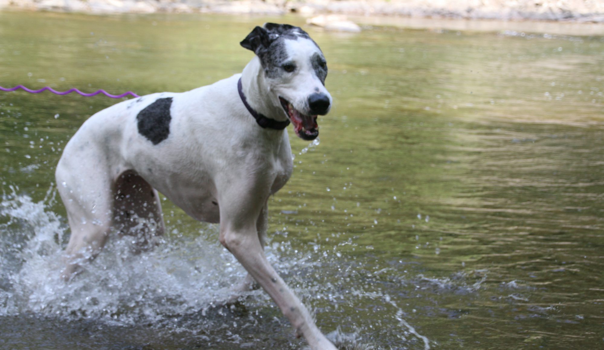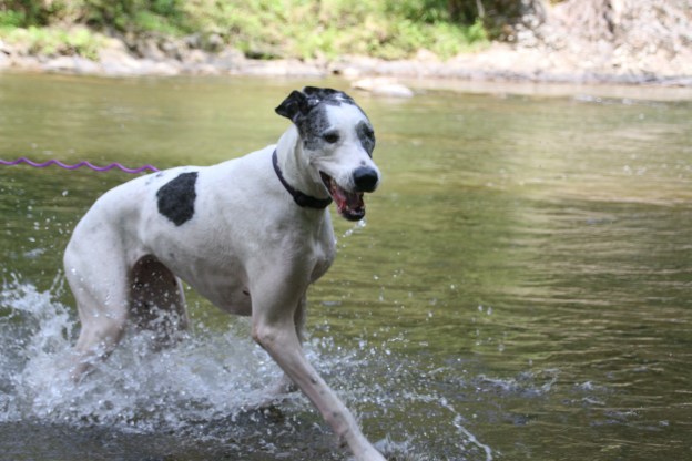 Pearl was a little nervous with all the people, but quickly adjusted to all of the fanfare for her. One guy ran out of a local store to ask Jennifer what kind of dog she was. He and his wife had a bet, Greyhound or Great Dane. He won.