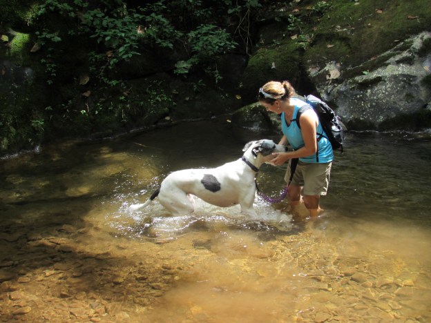 Today, we hit the trails.  Pearl hiked about 7 miles with us on 2 different trails (Pete’s Branch Falls Trail and Margarette Falls Trail, both in Cherokee National Forest North).  We have confirmed something that we had suspected for some time.  Pearl is a water dog!  In fact, water crossings will often give Pearl a case of the “Zoombies” which can be a problem when you are attached to her at the waist.  A few times, she laid down in the creek to cool her belly, as we all need to do from time to time.